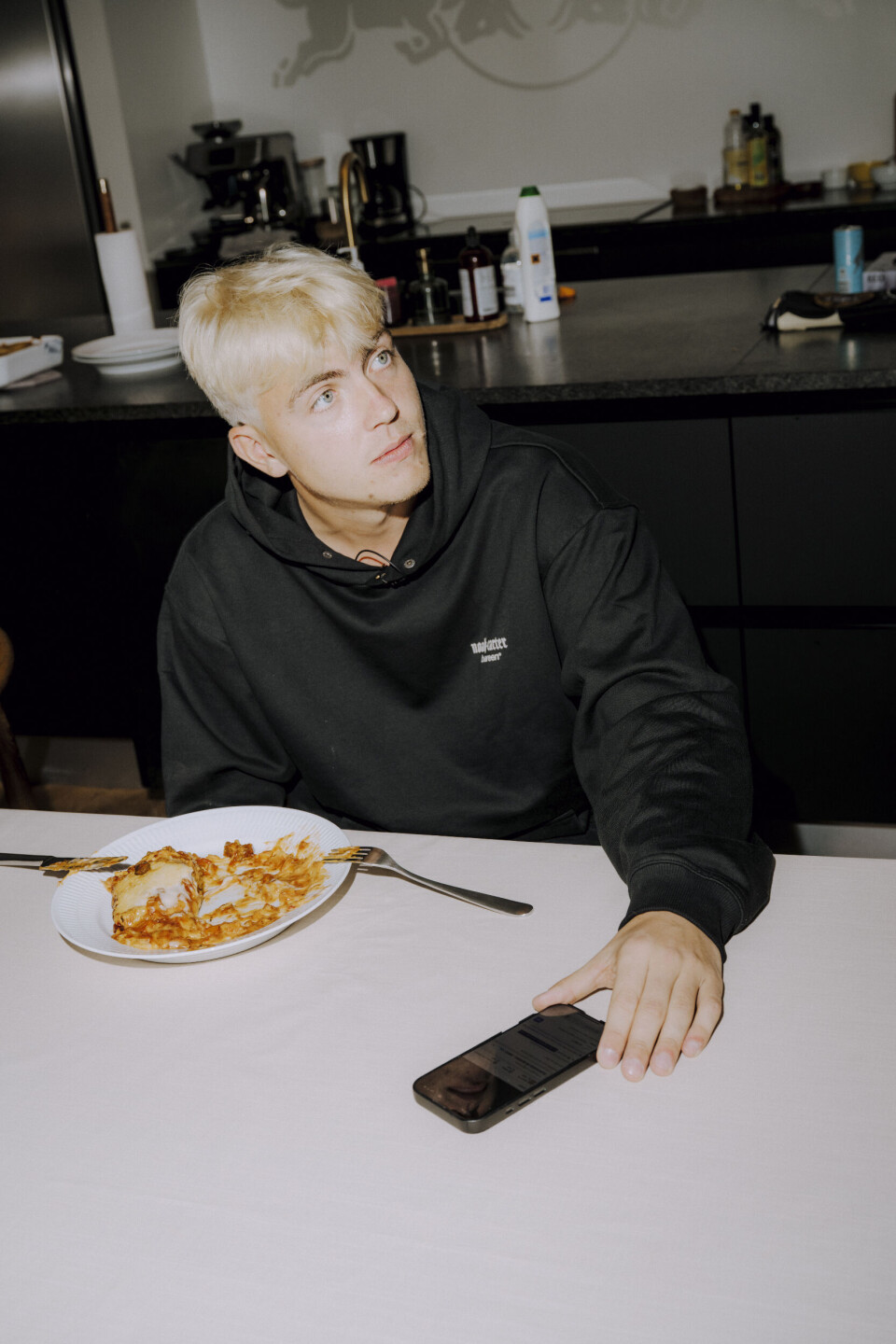 Inde i husets hjerte, hvor vi befinder os, står tre computerskærme opstillet i det perfekte gamer-setup. En stor flydersofa pryder midten af rummet, og i det åbne køkken står dagens gæstekok, madlavningsinstagrammeren Benjamin Kanu, og tryller ved gryderne. Han er ved at udøve sin signaturlasagne, fortæller han.