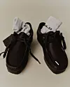 Wallabee-modellen beholder den traditionelle form, men kommer i et nyt mørkebrunt læder med sølvhuller til snørebåndene.