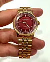 Uret har en lækker vinrød sektorskive, central sekundviser og rosaguld PVD i rustfrit stål.